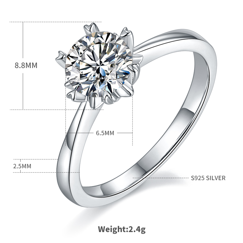 Home / Straight Arm Classic Snowflake S925 Silver Plated White Gold Moissan Diamond Women's Ring 1 Ct D